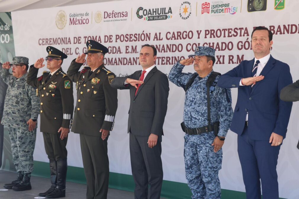 “Hoy acompañamos en su toma de protesta y le dimos la bienvenida a nuestro Estado, al C. General de Brigada E.M. Fernando Colchado Gómez, nuevo Comandante de la XI Región Militar. Aquí en Coahuila trabajamos con voluntad y coordinación con el Ejército Mexicano y las Fuerzas Armadas, siempre sumando esfuerzos para mantener la seguridad, la paz y el desarrollo de nuestro estado”, manifestó el Gobernador de Coahuila.