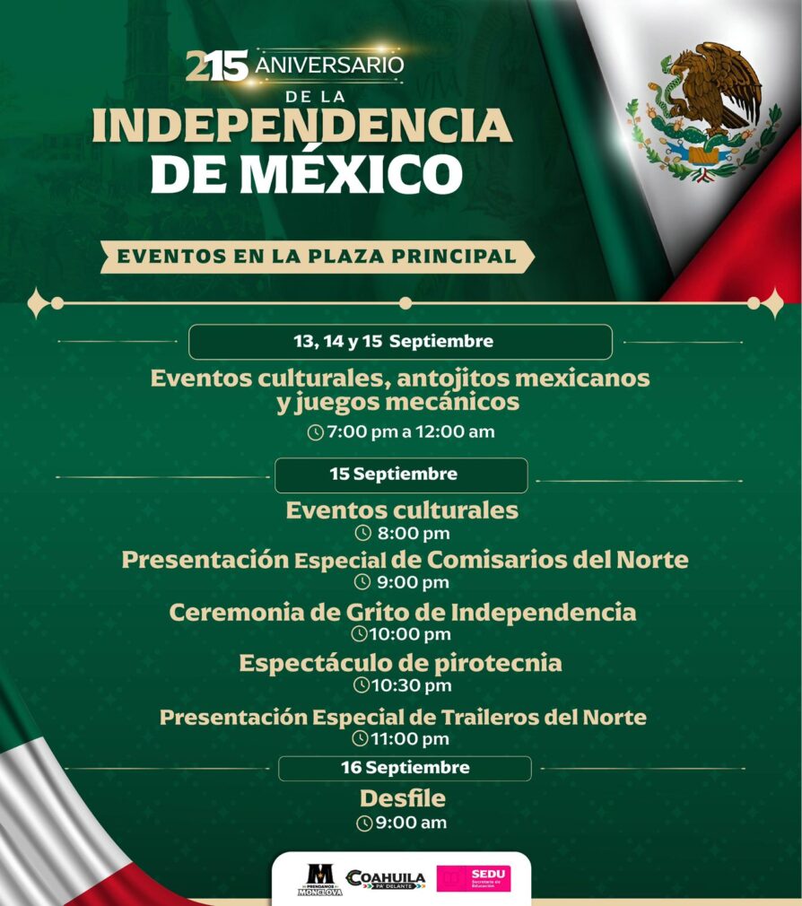 Este 15 de septiembre, a partir de las 19:00 horas, la Plaza Principal de Monclova será el escenario de una gran fiesta popular con eventos culturales, juegos mecánicos y antojitos mexicanos para toda la familia.