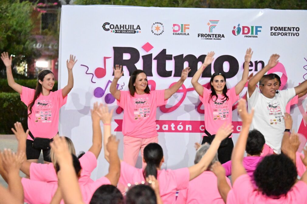 Frontera, Coahuila; a 17 de octubre de 2025.- Con el objetivo de generar conciencia sobre la importancia de la prevención del cáncer de mama y brindar apoyo a una mujer que enfrenta esta enfermedad, en la Plaza Principal de Frontera se llevó a cabo el Zumbatón con causa “Ritmo en Rosa”, un evento organizado por el Gobierno Municipal en coordinación con el DIF Frontera, a cargo, de manera honoraria, de la arquitecta Marifer Martínez Pérez, de su directora Karen Cadena, y con el apoyo de la Dirección de Salud y el Departamento de Fomento Deportivo.