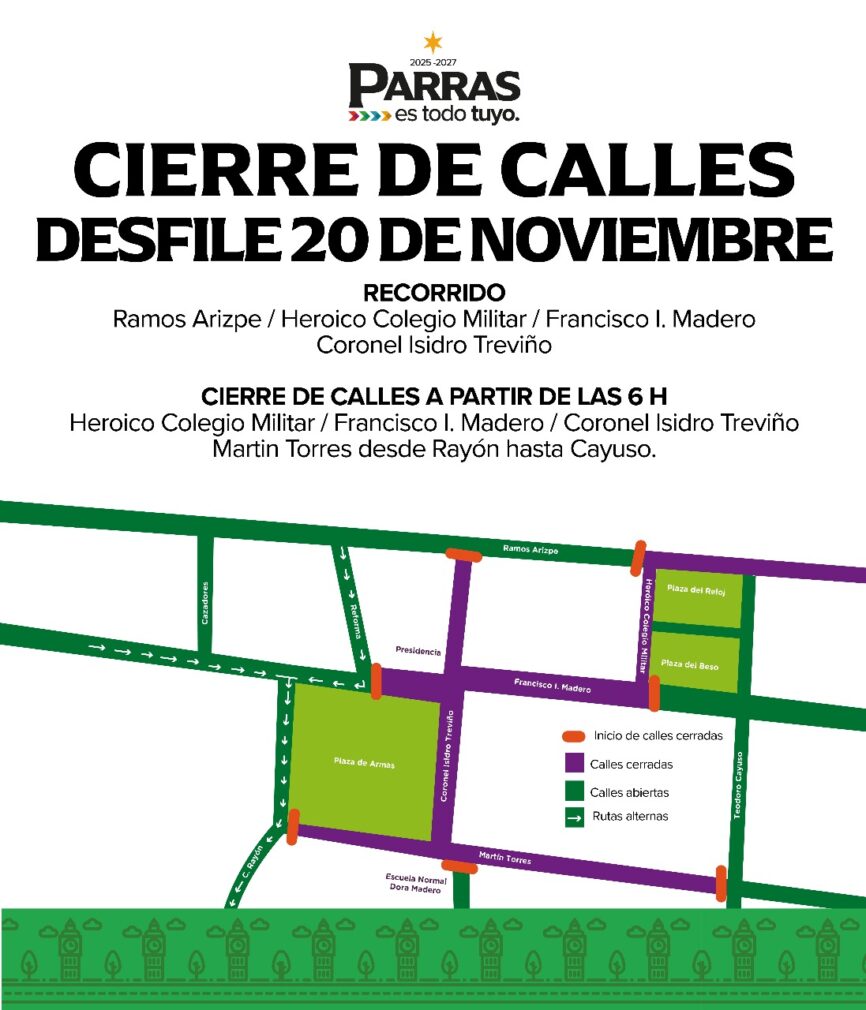 Debido a la realización del desfile cívico deportivo, con motivo del 115 Aniversario de la Revolución Mexicana, el Gobierno Municipal informa sobre el cierre temporal de calles a partir de las 6:00 de la mañana de este jueves 20 de noviembre.