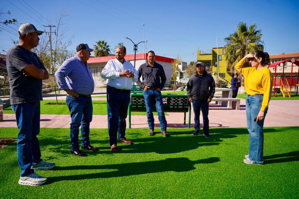 Durante el recorrido se constató que ya se cuenta con juegos infantiles instalados, pasto sintético colocado, mobiliario urbano, banquetas concluidas, mesas y bancas de concreto, así como alumbrado público funcionando, además de trabajos finales de limpieza, acabados y adecuación de áreas verdes.