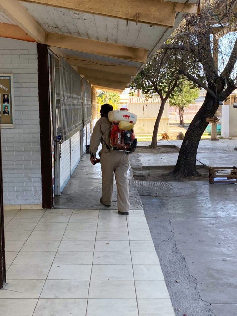 El director de Salud Municipal, Dr. Miguel Ángel Sánchez Leija, llevó a cabo las fumigaciones de manera oportuna, ordenada y conforme a los protocolos sanitarios establecidos, con mantener las escuelas libres de plagas como cucarachas, arañas, ciempiés y otros insectos que pudieran provocar accidentes o afectar la salud del alumnado.