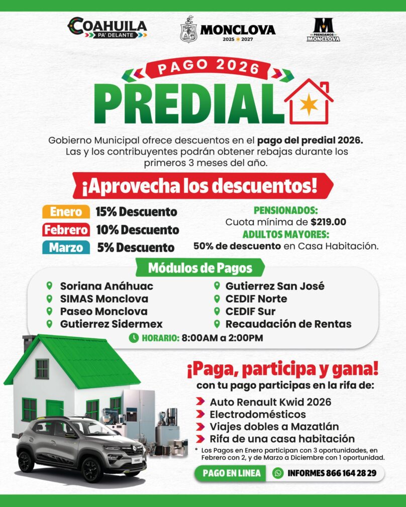 Quienes realicen su pago durante enero obtendrán un 15% de descuento; en febrero, el descuento será del 10%, y en marzo, del 5%. Este esquema incentiva el cumplimiento oportuno de la contribución, apoya la economía familiar y permite contar con recursos para la realización de obras y acciones en beneficio de las familias monclovenses.