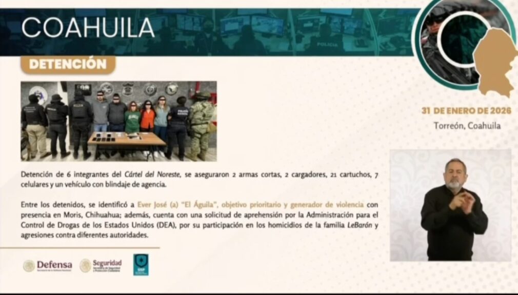 El Secretario de Seguridad y Protección Ciudadana (SSPC), Omar García Harfuch, reconoció al Gobierno de Coahuila por las acciones coordinadas para la detención de Ever José “N” mejor conocido como el “Águila”, uno de los objetivos prioritarios del Gobierno Federal.