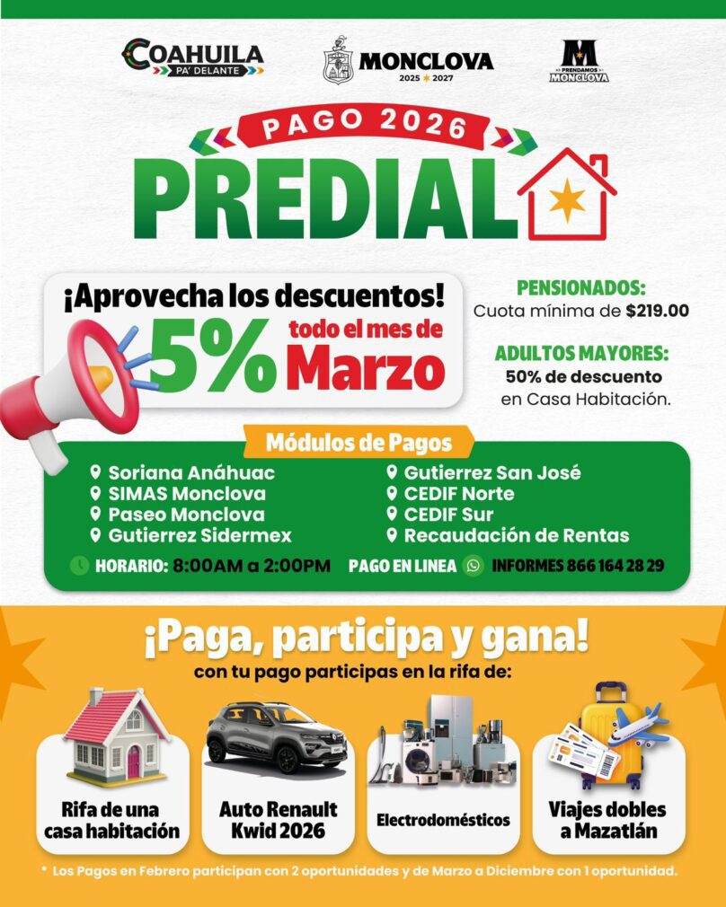 Monclova, Coahuila, 03 de marzo de 2026.- El Gobierno Municipal que encabeza el alcalde Carlos Villarreal invita a la ciudadanía a aprovechar el 5 por ciento de descuento en el pago del impuesto predial durante marzo, último mes del programa de estímulos del primer trimestre, el cual concluirá con la rifa de un automóvil Renault Kwid 2026 como reconocimiento a la responsabilidad de las y los contribuyentes.